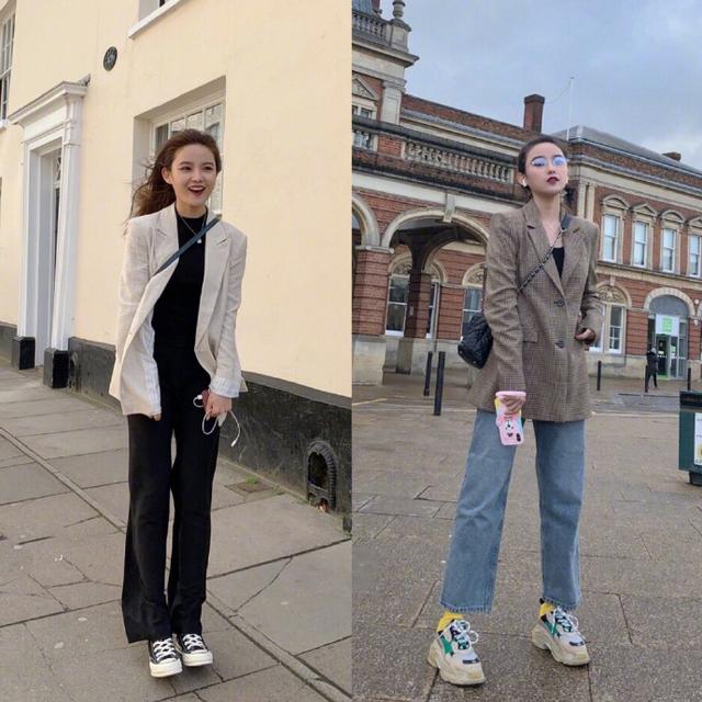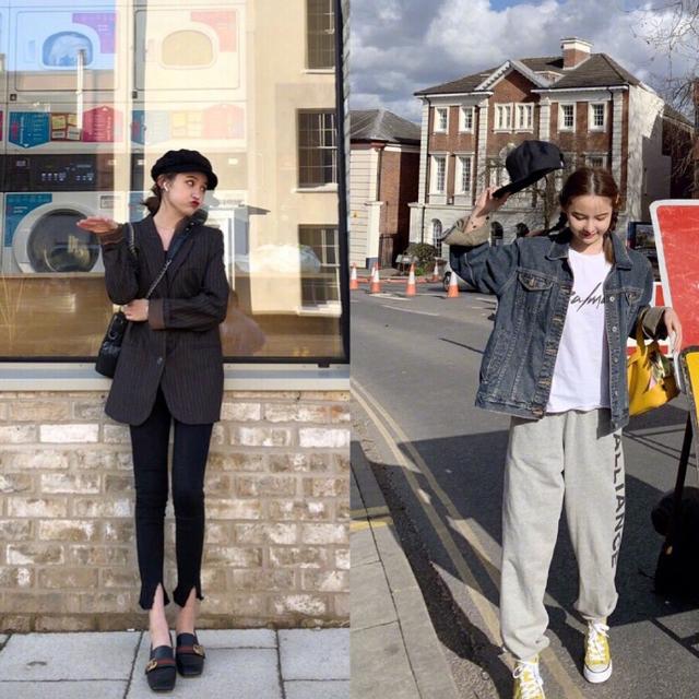 廓形的西服外套洋气又百搭,很喜欢图一这种调调儿~宽松版的更加“好穿”,也不挑身材,遮肉又显瘦!西服的版型很好,立体感很强,肩膀还做了垫肩设计,可以提升人的气质!小黑裤的搭配很你测,裤脚的开叉设计小露性感~搭配黑色贝雷帽,洋气极了!潮范十足!