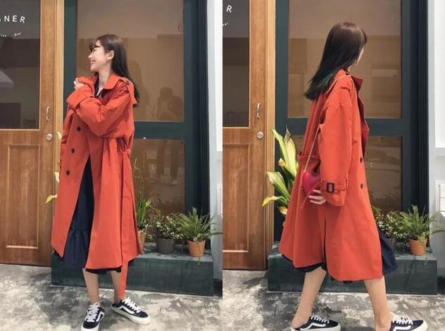 搭配3、这款是砖红色设计的风衣,宽松的版型让你穿上就很遮肉显瘦的,后背还有层次感的设计,很有个性的设计,这也是最近很新潮的一款单品,长度刚好是超过膝盖处的穿搭法,后背还有绑带的设计,内搭黑色网纱裙,是不是超显身材的。
