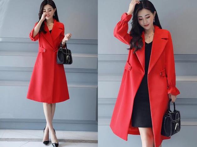 搭配4、同样是红色的风衣,双排扣的设计成为了风衣最大的特点,小翻领的设计突显出高级感,而且完全不需要考虑身材问题,谁都可以驾驭的一款风衣,袖扣和腰带都是同色系的,让你穿上就很有时髦风格,搭配黑色裙子,荷叶边的裙子怎么穿都很特别又显瘦。