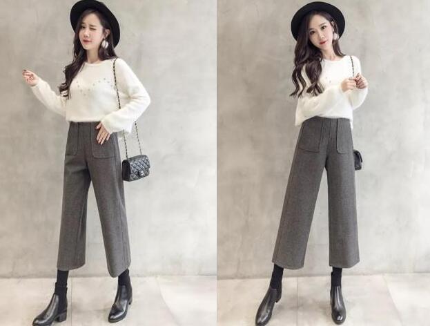 深灰色为颜色设计的阔腿裤,裤子两边有两个口袋作为装饰,并且高腰设计的裤子又是那么的显高级感,同样是毛呢的材质,无论是秋冬季节都是可以遮肉显瘦的,九分的长度可以让你穿上显腿长的气息,但如果想要不露脚踝的话,最好是搭配一双短靴,这里搭配的是黑色短靴,太显高显瘦了。