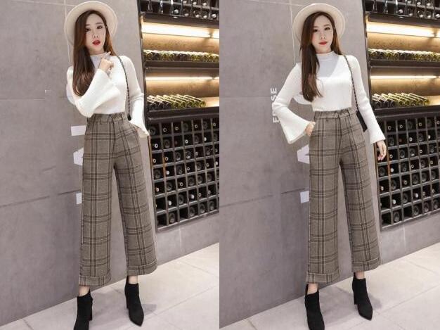 格子设计的裤子,总是带来复古又个性的气息,格子元素是在秋冬季节最潮的一种元素了,同样是高腰的设计,可以遮住你的腰部肉肉,又更显瘦,九分的长度无论谁穿上都那么的显高挑身材,搭配黑色短靴,风度和温度共存的穿搭法,显瘦又好看。