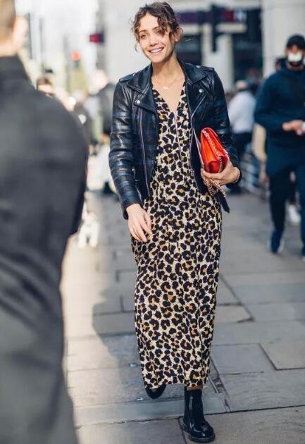 皮衣外套平时给人的感觉都是个性帅酷的,一般搭配小黑裤居多,皮衣与豹纹吊带连衣裙的搭配,反而给人一种很新鲜的感觉,走在人群中,回头率十足。