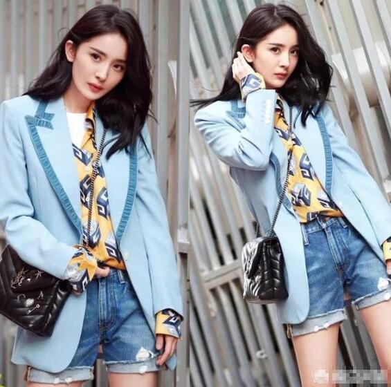 莫兰迪色系中的蓝色属于显白色调,杨幂这件蓝色西装外套领口设计独特,尽显少女气息,搭配牛仔短裤,尽显大长腿。