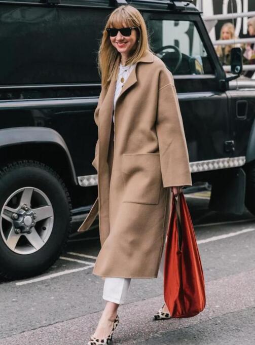 驼色的长款羊绒大衣内搭白色,简约大气,但不够有新意,但搭配一双尖头的豹纹高跟鞋之后,增添细节感外,更多了一分时髦感与女人味。
