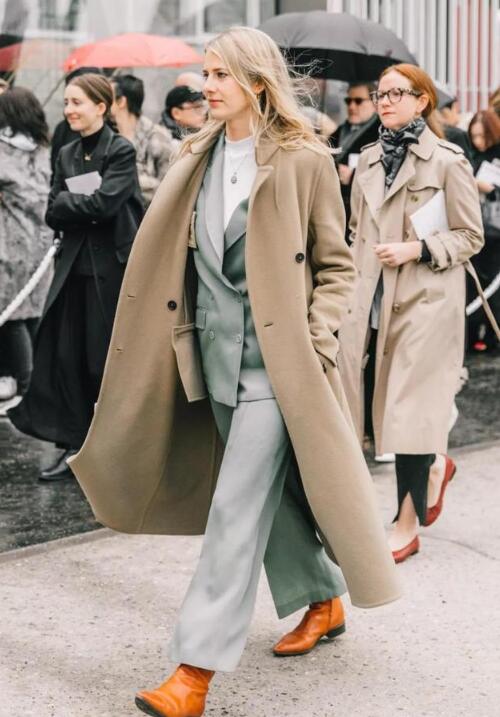 灰绿色的套装外套驼色长款外套,短款外套+长款外套的叠穿法,尽显外套的个性范,搭配焦糖色的裸靴,瞬间吸睛,高级感满满。