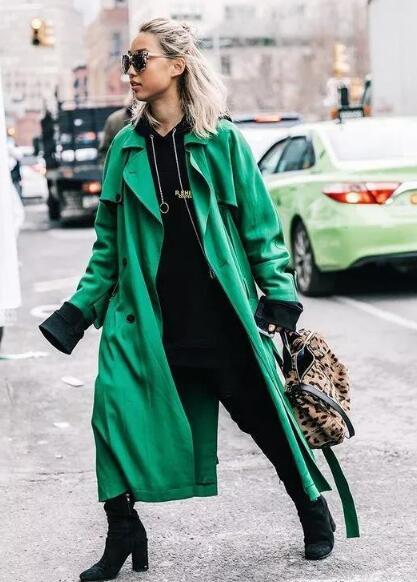 秋季热门外套单品非卡其风衣莫属,其实除了卡其风衣,其他颜色的风衣更具风采,比如绿色风衣,搭配黑色卫衣+黑色小脚裤+黑色高跟裸靴,鲜亮不失稳重感。