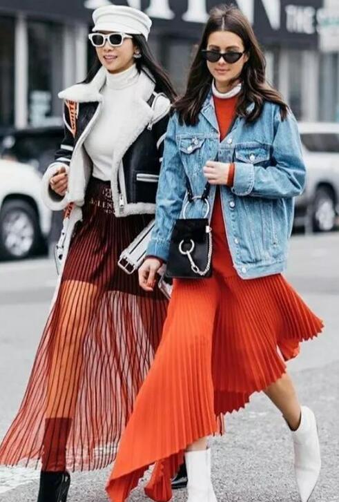 牛仔外套基本上是人手一件,搭配牛仔裤或者小脚裤又觉得有点普通,秋天适合穿什么外套好看?不妨学习一下时尚博主,搭配橙色的斜面百褶连衣裙,再配上一双白色尖头裸靴,拉风十足,超级有范有木有。