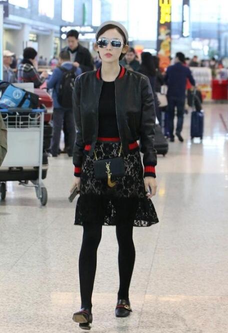 同样是黑色的皮衣,搭上黑色的裙子在皮衣的帅气之中加入柔美的感,刚柔并济,非常凸显气质。皮衣的的下摆和裙子腰部的红色,遥相呼应,酷帅又个性,非常吸睛。