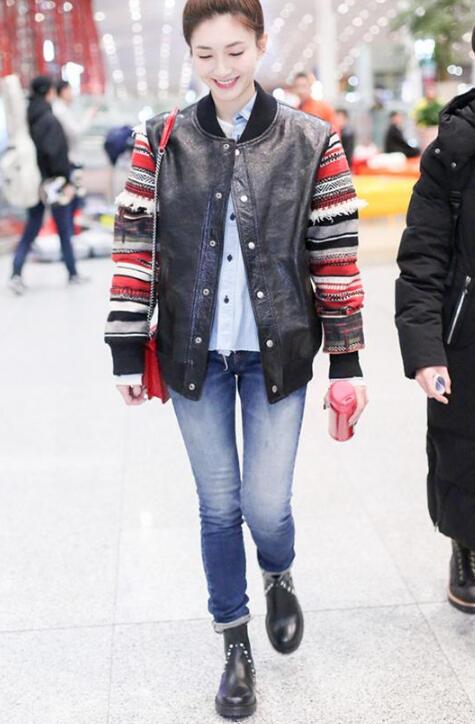 如果是小仙女不喜欢大片红色的皮衣,可以在黑色皮衣上加入红色,做一些点缀,显得不那么单调。下身pick牛仔裤,在皮衣的酷感上又加入点个性。脚上搭配黑色靴子,和皮衣的黑色构成同色系,格外简约。