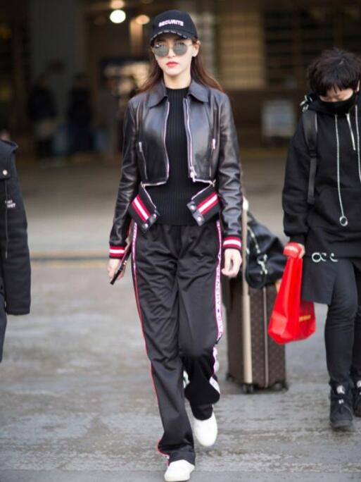 喜欢酷感十足的girl,可以pick全黑look,黑色皮衣,帅气逼人。皮衣的下摆,加入红色和白色条纹元素,皮衣显得得不那么单调,点缀得恰到好处,酷帅又个性。而下半身的裤子选择的是黑色运动裤,侧边的配色与上身皮衣的配色相呼应,显得十分的协调。