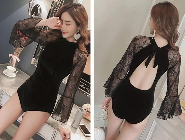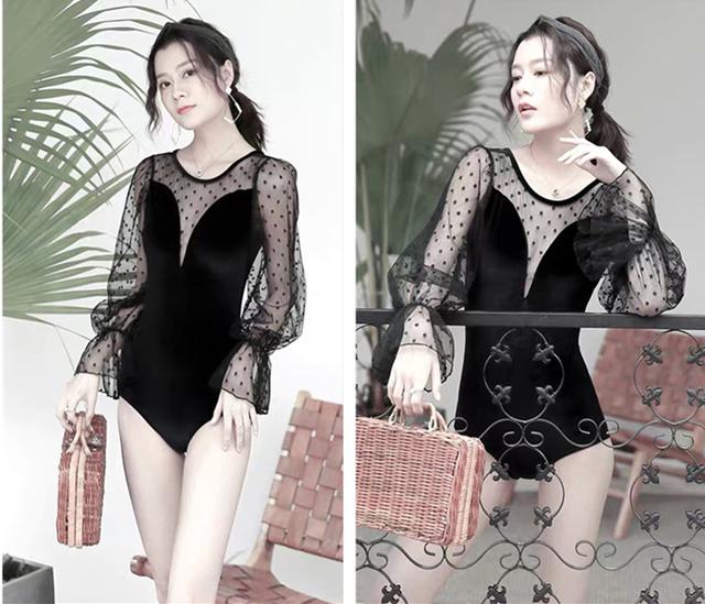 说到性感怎么能少的了我最爱的黑色,这是一款会让你男朋友移不开眼的性感泳衣。当丝绒的地质与波点蕾丝相互拼接,泳衣的正面大V领让你姣好的身材展示的很完美。虽然说是长袖款,但是却一点也不闷热,蕾丝与波点结合,微透出肌肤,让你整个人充满了女人味。款式是平时喜欢性感风的小仙女们最爱的连体三角,修身的版型完美的展现了你的好身材和大长腿,实在是太好看了