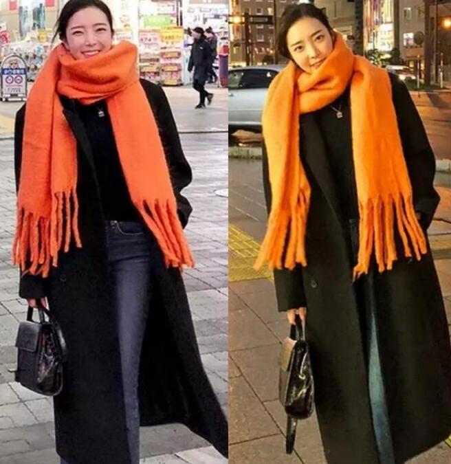 冬季穿着黑色是永恒的经典,但是有时候却会显得单调,这时增加一条围巾,立刻有种清新干净,时尚又简约的范儿,将围巾围起来与自然垂下去,也可以搭出不同的风格。活力橙围巾打破了冬日的沉闷又非常吸精哦!