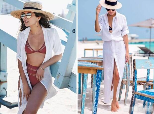日常出游的话,白色单品的出镜率其实还是蛮高的,简约大方不会出错,白色衬衫不仅能罩在泳衣外面当防晒衫,还能完美的展现你那双若隐若现的美腿,但一定要记得选择要选腰带款哈,更能拉长腿部线条比例。