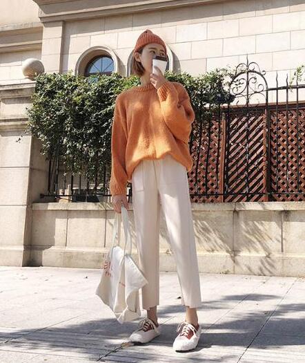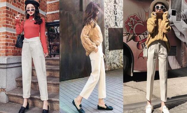 这款米白色烟管裤采用的是很宽松的直筒休闲裤,外貌酷似西装裤的版型,也是比较通勤的一款,很百搭的米白色色调,任何肤色的女生都可以驾驭,再加上九分的裤长,也是超显腿长的。