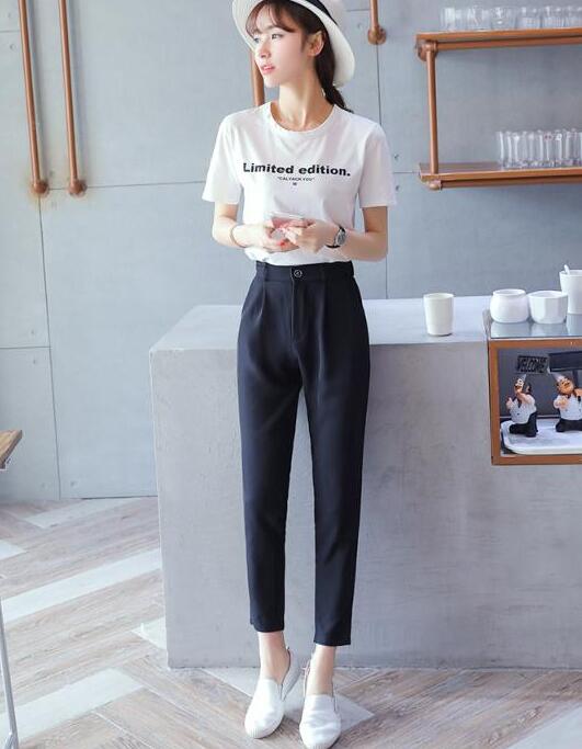 这款西装裤比较正式感,一般最流行的是黑色的裤子,经典又时尚,而且黑色有显瘦的功能,高腰的九分裤,也是很显高显瘦的,直筒的裤型掩饰腿部的瑕疵,上衣可随意搭配衬衣T恤,总之就是一款非常百搭的裤子。