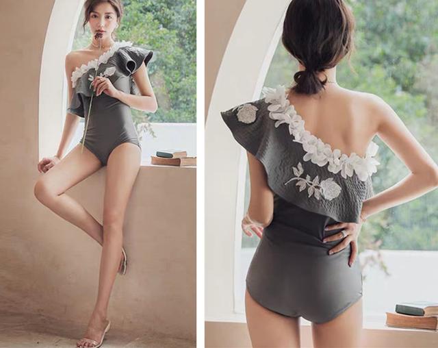 如果你在去海边的前一天吃了很多东西,小腹微凸,那么你可以选择一件高腰设计的连身泳衣。这种设计成功的弱化了腹部线条,收腰提臀的这个道理我想大家都懂。这款花边式的连体泳衣小编我也特别喜欢。色系是带点复古的灰色系,低调深沉,对肤色的包容性很大,黄皮的妹子也可以大胆尝试。肩膀位置的斜肩花边的设计修饰肩部曲线,给人视觉上肩膀很窄的错觉,同时分散注意力,花边的样式更能增加胸部位置的层次感,无形中让人觉得你是个大胸。连身的卡款式拉长身形,立马塑造出腿长两米的效果。