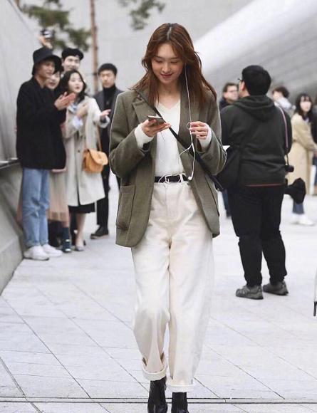 以前的女生,在穿衣方面更多追求的是甜美可爱气息,现在的女生就不一样了,她们更希望能够展现自己独特的一面,所以在日常穿衣风格上更偏向于帅气的感觉。如果你也是这种很有个性的女生,可以试试这种穿搭方法。白色T恤和浅蓝色阔腿裤,一看就很有春天的感觉,腰部系着的黑色腰带,强调了腰线的位置,最后为了保暖,再来一件浅灰色的西装外套,整体色调看上去很清冷,给人一种冷淡风的感觉,像极了日系街头风。