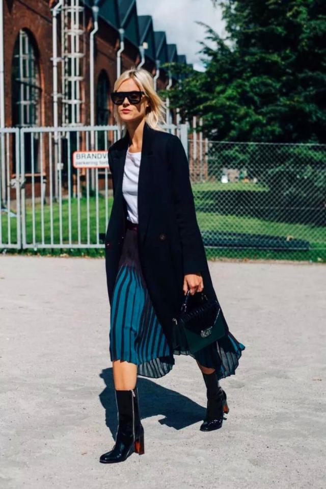 百褶裙的最佳CP就是毛衣啦!时髦保暖两不误。初秋的午后,着一袭或长或短的百褶裙,搭配一件宽松的毛衣,慵懒的坐在街头的露天咖啡厅,真是赚足了回头率呀!胯部比较宽的菇凉,一定记住要搭配比较长的上衣来遮住自己的胯部,只需露出百褶裙的裙摆即可,搭配风衣或者中长款的小西装显得干练十足,而搭配中长款的宽松毛衣则会显得比较可爱萌萌哒。