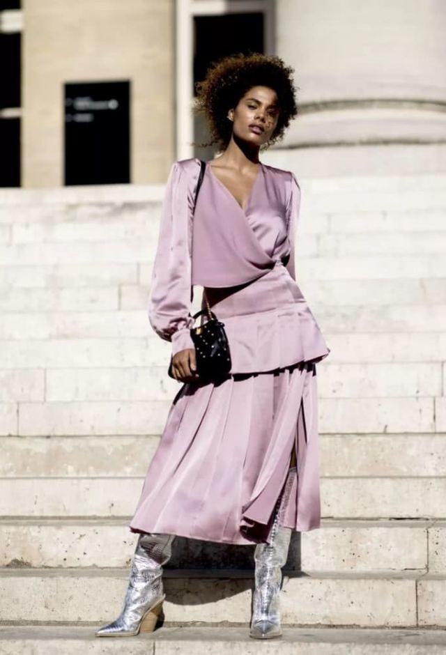 缎面裙因为有着极强的光泽感,所以不同肤色的人在颜色的挑选上也有讲究:白皮星人推荐尝试香槟色、金色、银灰色这些高级显贵气的颜色来穿,可以提升气质;黄皮星人推荐选择饱和度低但明亮度略高的颜色,例如墨绿色、藕粉色都能在很大程度上提亮肤色,从而达到显白的效果,洋气又好看;而黄黑皮则推荐黑白色、酒红色、深蓝色这种有质感的色彩,借助这些显贵显气质颜色的缎面裙来打造高级感。