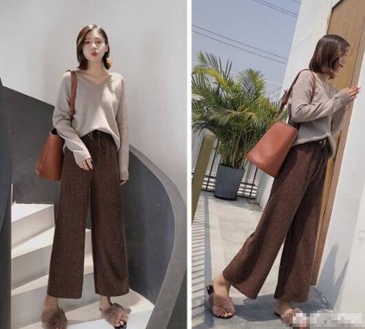 深咖色阔腿裤搭配灰色宽松V领毛衫,满满的时尚又高级,关键是色彩搭配谁都能驾驭,莫兰迪色调的风格格外的显气质哦!