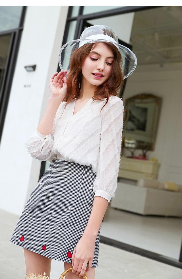 首先要注意的事,我们在选择小衫搭配A字裙的时候,裙子不要过长,否则的话会给人一种显得腿短的视觉效果。而半身款式的A字裙就可以完美的解决了粗腿尴尬问题。同样还有一点要注意,在挑选A字裙的时候最好选择坠垂感比较好的,这样穿出来的效果美观又大方,还很有女人味哦!