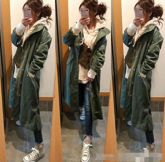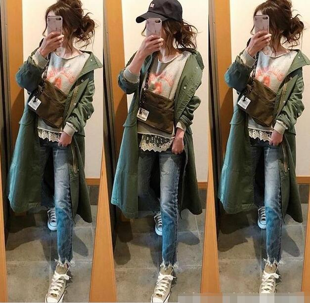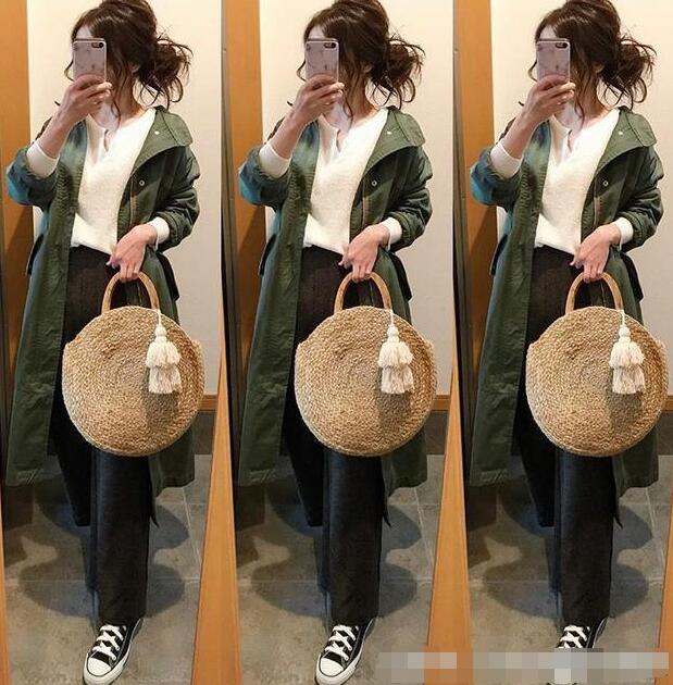 圆领白T搭配黑色高腰宽松阔腿裤,突出腰线不仅显高也显瘦,外搭军绿色长款连帽风衣,小个子也不怕显矮;黑色裤装搭配黑白撞色帆布鞋,裤装与鞋履配色一致更拉长腿部线条显腿长;搭配圆形藤编白流苏装饰包包,提亮整个穿搭色彩、增添清爽感同时也中和风衣的硬朗。