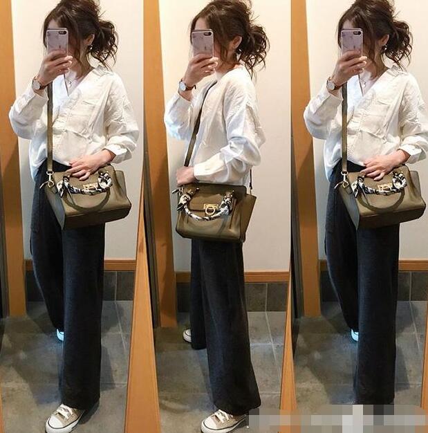白色V领oversize超大廓形衬衫搭配黑色高腰阔腿裤,上下装都采用廓形单品,只要突出腰线就足够显高、显瘦,不会穿出无精打采模样。搭配燕麦色帆布单鞋更穿出休闲感,军绿色手拎、肩背两用方包让实用又凸显精致感,还能提亮整个穿搭色彩。