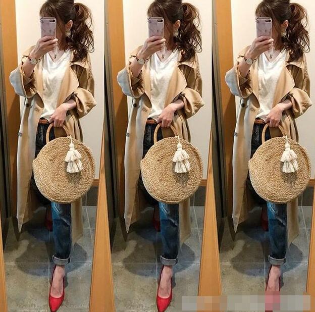 搭配藤编单品当然不能少了牛仔单品。白色宽松显脸小V领T搭配深蓝色毛边装饰卷边直筒牛仔裤,内搭清新满满;搭配浅棕色细腰带、春天女人休闲穿搭技巧卡其色长款西装领风衣、原型白流苏装饰藤编包包,同色不同质地的单品叠搭整套穿搭整体感超强,自然穿出高级感。鞋履选用红色箭头细高跟单鞋,休闲中穿出优雅女人味。