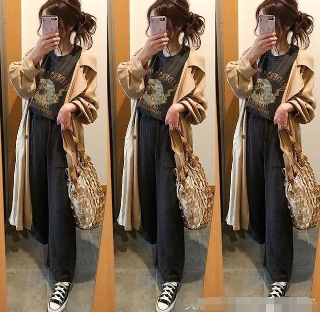 春季休闲穿搭穿出自然效果,采用自然原色单品更加。动物字母印花黑色圆领宽松T搭配黑色高腰阔腿裤、黑白撞色帆布鞋,内搭单品从上到下配色统一,拉长身材线条超显高;外搭卡其色西装领长款风衣穿出帅气走路带风,搭配与风衣同色的杏仁色、白色皮编撞色包包,二者呼应同时也穿出春夏季的自然风。