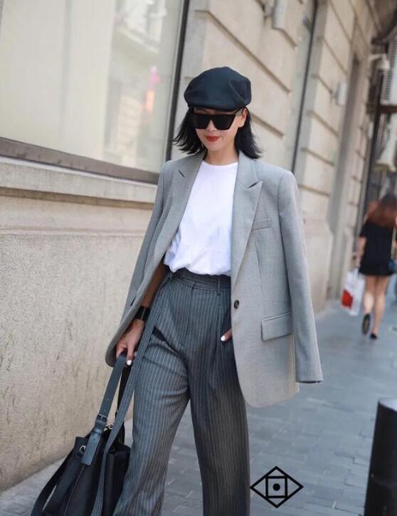 灰色的中性款小西装搭配竖纹的时装裤,时尚服装,给人一种走路带风的感觉,那种自信大气的味道让人过目难忘。
