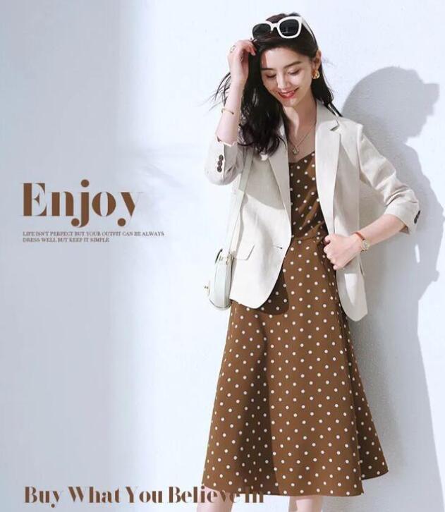 浅卡其色的休闲小西装搭配咖啡色的波点连衣裙,自信阳光、魅力四射,这样的一身装扮定是办公室里最漂亮的。