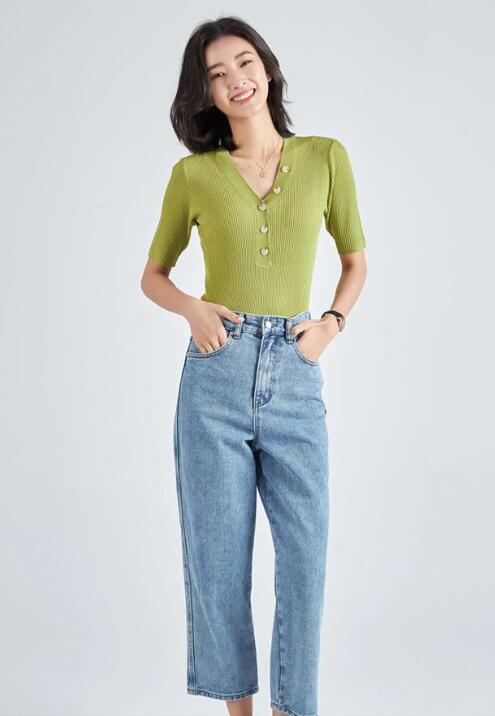 牛油果绿的短袖针织衫清新脱俗、柔美文艺,搭配九分牛仔裤是清新时尚味道,上班通勤的时候穿上它办公室的团宠一定是你。