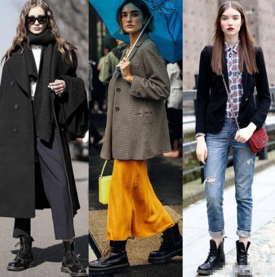 马丁靴:马丁靴也可分为短筒靴、中筒靴、长筒靴三种,颜色图案多,以黑色常见,棕色复古百搭。马丁靴的百搭性,想必大家都知道,hold住酷帅的裤装,也配的了清新温柔的裙装,而且马丁靴即便是已经很旧了,却仍然很漂亮,时尚感丝毫未减,或许还能增加些复古味道。