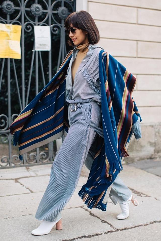 同样是披肩法但是更加随意与个性,整个人很是活泼欢快。如果穿搭在纯色简约大衣上的效果更是有趣,层次与跳跃感超强,还能轻松转变风格,采用披肩的方法就能显得优雅稳重贵妇感十足。