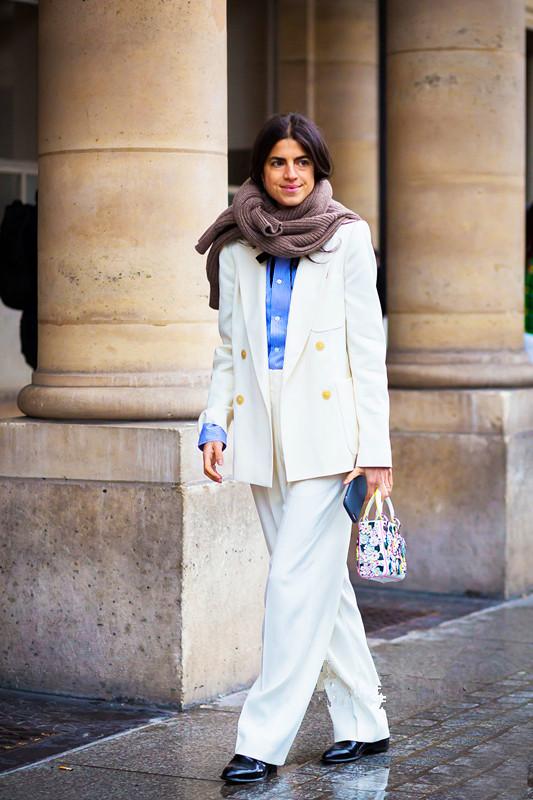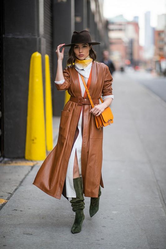 对于不是太冷的天气又想显得与众不同,一条小小的方巾是最好的解决方法。一条小方巾简单地系在脖子上,干练又酷劲十足,如同西部牛仔的女郎,精准射中你的心。选择一条身上已有的颜色的围巾,例如图中,与包包一个颜色的围巾起到了相互呼应的作用,让人眼前一亮。