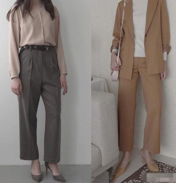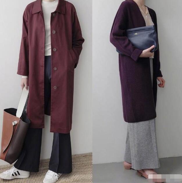 杏色衬衣搭配灰色阔腿裤,外搭深紫色毛呢大衣,显白显气质,又或者黑色长裤+米色针织衫,外搭酒红色风衣,时髦简约chic风,搭配棕色大包包,温柔干练的通勤风。