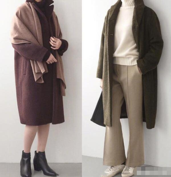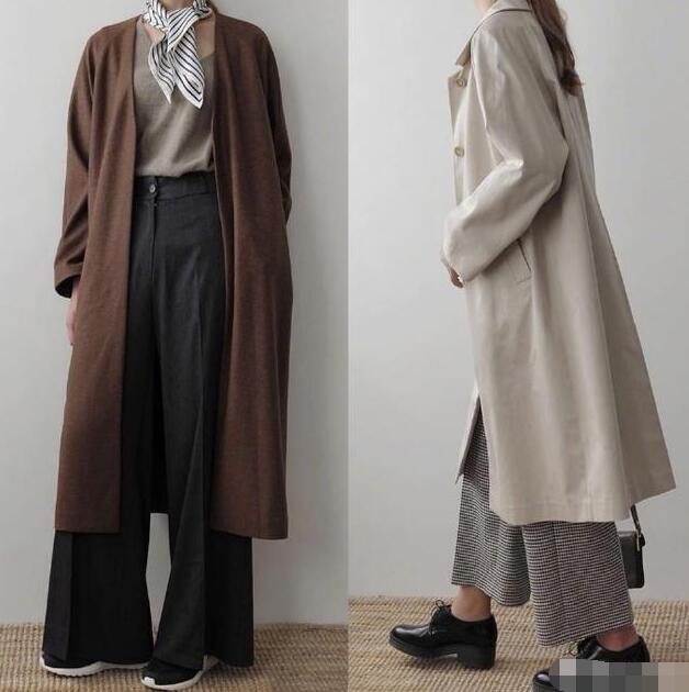 深棕色外套,搭配黑色阔腿裤,垂顺的质感,搭配浅灰色V领针织毛衣,温柔又遮肉,想要穿搭更出彩一点,搭配条纹丝巾,浪漫温柔的法式小情调。卡其色风衣搭配格纹长裤,配上小皮鞋,复古时髦的温柔风。