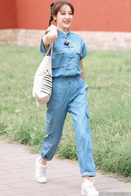 热巴这身蓝色牛仔连体裤就非常的减龄,清爽的蓝色配色能够衬托出热巴的少女感,脚下踩一双小白鞋,显得非常的青春有活力哦!