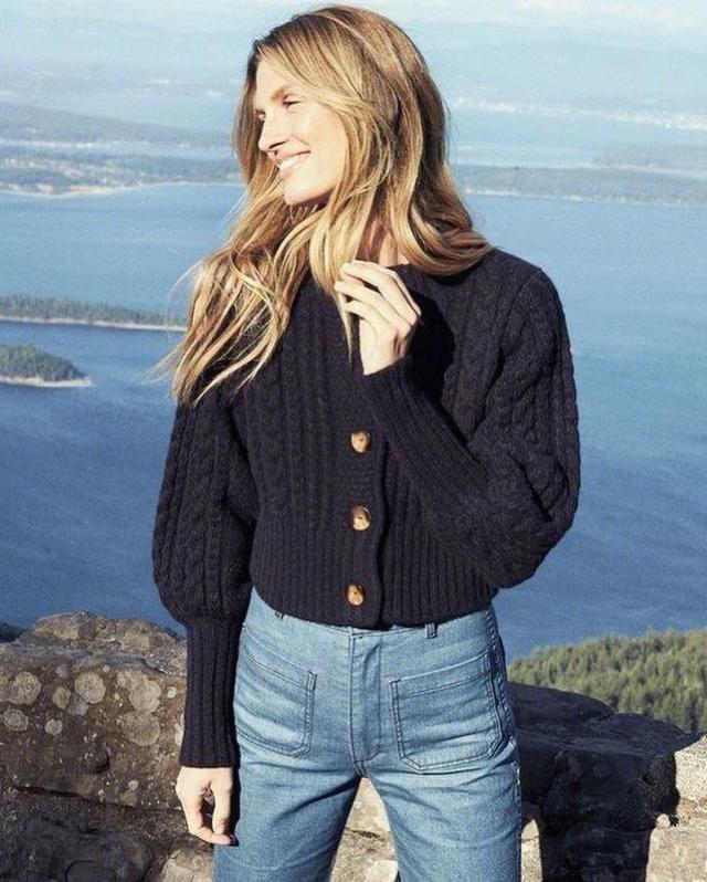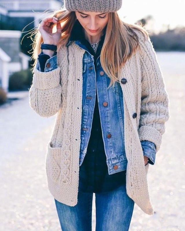 春暖花开的季节最适合一件开衫的毛衣,搭配合适的话你就是妥妥的时髦精。图中的模特利用开衫毛衣搭配一身蓝色的牛仔,颜色清新舒爽,混搭的风格让人眼前一亮,别致青春又减龄。毛衣的柔软加上牛仔的硬挺,相互的融合碰撞出时髦的火花,保暖系数也是超高的呈现。这一款米白色开衫毛衣上面使用了很多的花样织法,文艺又复古。若想营造别样的风格,内搭还可以选择好看的格纹衬衫。