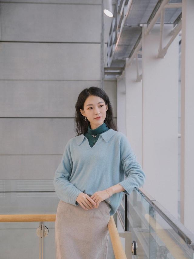 雾霾蓝介乎蓝色与灰色之间,天然具有蓝色的清新宁静与灰色的优雅高级。若是想要打造出气质清新淡雅又平和沉静的穿衣风格,可以选择一款雾霾蓝的针织毛衣。细细的织纹能够轻松穿出优雅温柔的韵味,略微宽松的款式舒适自在,下装搭配一款浅灰色调的灯芯绒半裙,沉静的的气韵给人如沐春风的感觉。将针织衫松松地塞进修身裙中,瞬间打造好看的黄金分割线。内搭一件祖母绿的高领针织,不仅保暖而且更显气质,整体洋溢出浪漫的少女气息。