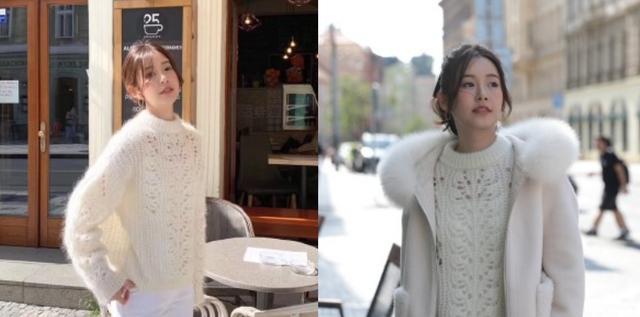 白色针织衫百搭又好看,不挑肤色,自带反光板的效果能让皮肤看起来更加透亮,是衣橱必备的单品之一。若是想要打造清爽仙气的味道,一身白的造型让你纯情又养眼。图中小姐姐乳白色针织镂空的的设计又仙又可爱,搭配洁白的修身长裤给人一种干净出尘的美感。天气寒冷的时候外搭一件米白色的毛呢外套,保证温度的同时也能散发出雅致唯美的韵味。柔软的白色毛毛领的加入显出如水般的柔情。