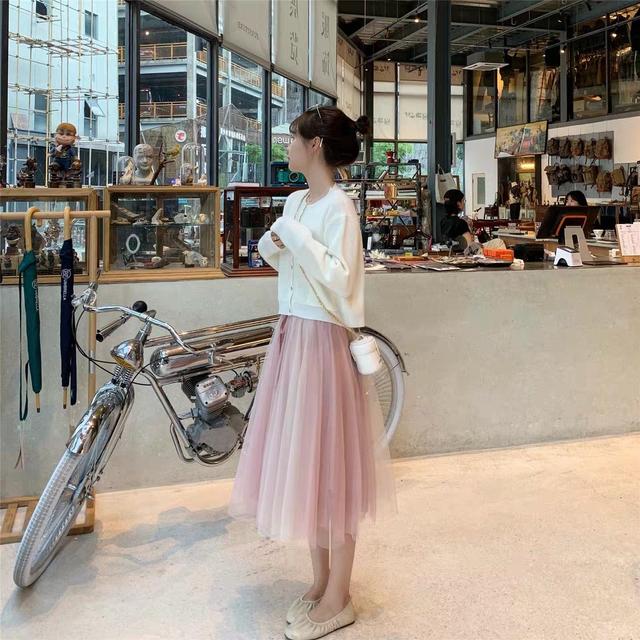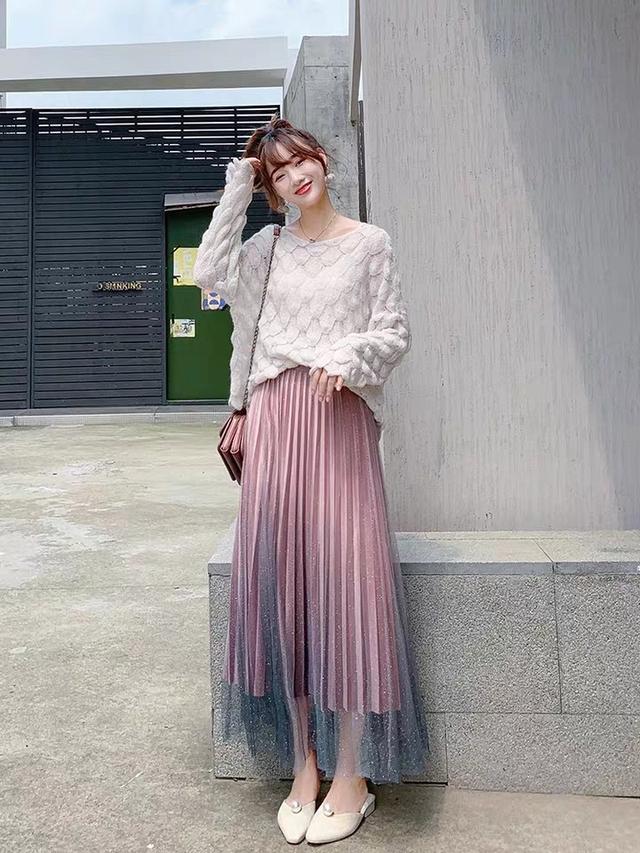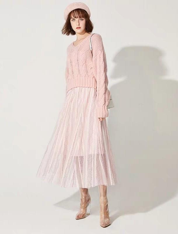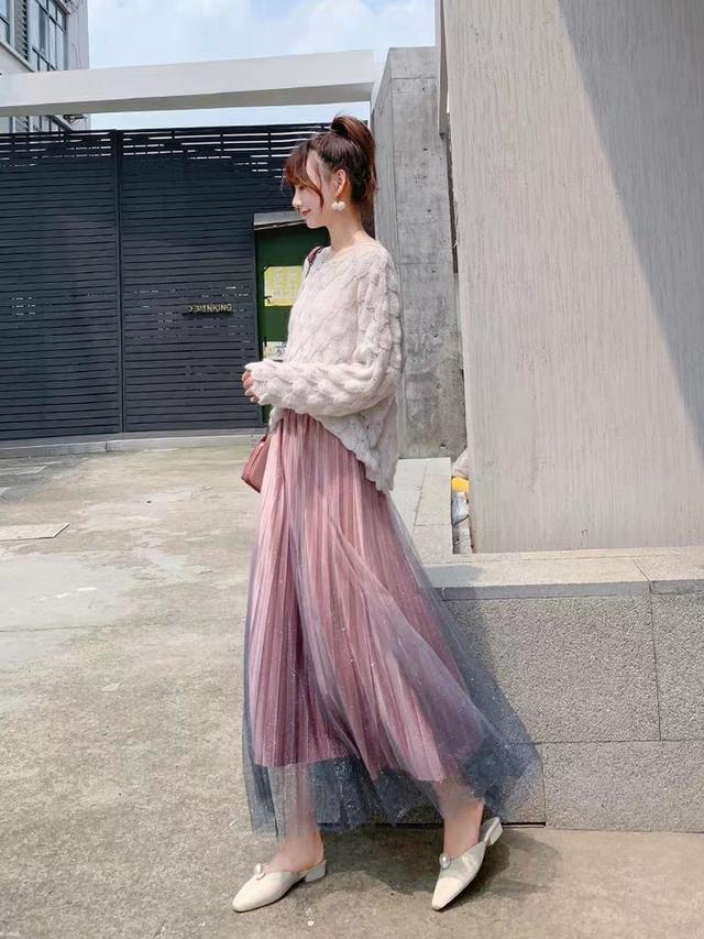 除了白色的毛衣以外,同色系的粉色毛衣和粉色纱裙的搭配也是非常和谐的,搭配屋,这一身搭配起来与白色毛衣相比较少了几分优雅,多了几分可爱的感觉,脚上再搭配一双透明的果冻鞋,给这一身的搭配增色了不少。
