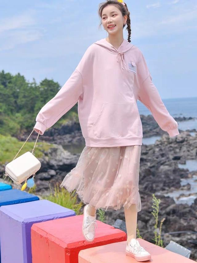 最后一种搭配是卫衣和纱裙之间的搭配,在这里我们选择的卫衣是一款比较宽大的卫衣,个子比较小的女生穿的话就会直接遮住屁股,显的会比较可爱一些。这件卫衣的颜色也是和裙子相同的颜色,所以说这一身的搭配还是比较适合平时性格比较甜美温柔的女孩子。秋天穿的裙子有哪些?