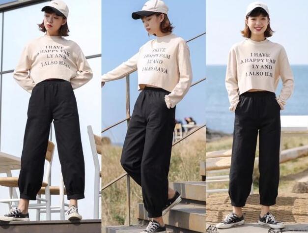 很休闲风的纯色萝卜裤,也叫做灯笼裤,很有弹力的可松紧腰围,自在舒适,裤脚口是收褶的,率性利落,基础的黑色色调,更容易搭配,工装的裤子,修饰腿部更显纤细,九分的裤长,155身高的女生搭配字母的T恤和休闲鞋,也能轻松显腿长的。
