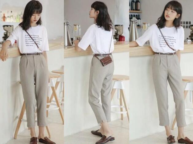 简约又显瘦的纯色烟管裤,通勤的西装裤,穿上身超级帅气的,收褶的腰围设计,女装搭配,修饰身材凸显小蛮腰,脚口的小开叉,特别的小心机,很适合155小个子女生的九分裤长,露出脚踝,搭配字母T恤和乐福鞋也是超时髦又显高的,再背上一个小型的包包,时尚又减龄。