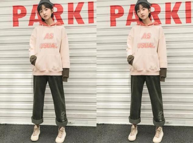 粉色设计的卫衣,适合少女的女生们,上身显嫩又减龄,袖子和帽子都做了撞色的效果,增加卫衣看点的同时,也增加造型的层次感,很休闲的宽松款式,卫衣搭配阔腿裤好看吗?很能遮肉显瘦,还不挑身材的呢,自带减龄效果的卫衣,搭配九分设计的绿色阔腿裤,瞬间增加你造型的时髦感,很潮的同时,还显高显瘦,2019年春天这样穿非常休闲舒适,非常好看。