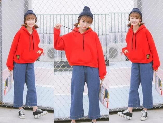 这款红色设计的卫衣,自带减龄的效果,上身显白的同时,还超气质的,好多学生妹都爱这款,不仅时髦好看,而且特有青春活力,连帽绳的设计,个性又好看,还多了几分休闲feel,版型是超宽松的设计,给人一种慵懒的感觉,随性自由,不仅舒适还很时尚,最好看的就是和牛仔阔腿裤的搭配,九分的裤长,适合个子矮的女生,上身显高又显瘦,再搭配一双黑色帆布鞋,这么穿真的很潮。