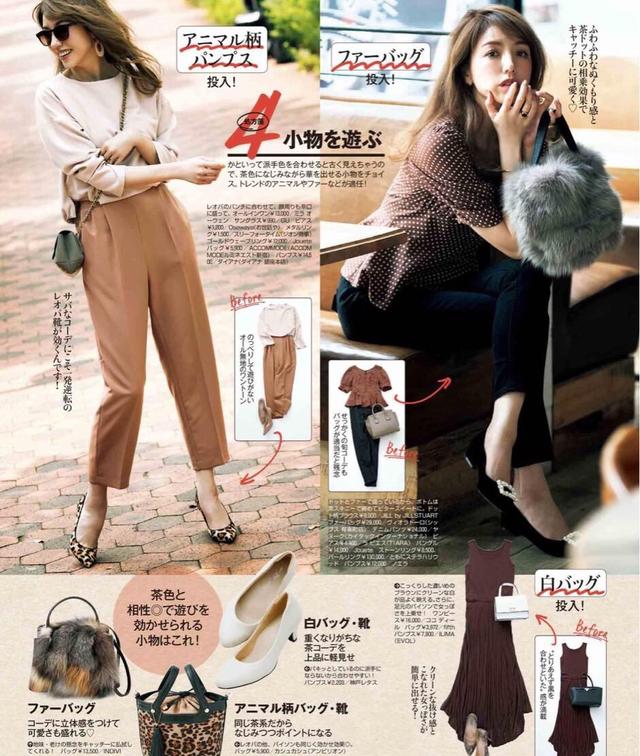 搭配豹纹的手包,最好是身上的颜色能跟豹纹本身单品色彩相近,这样搭配起来更协调,更能体现出优雅的女人味。比如,棕色系的单品就和豹纹中色彩有相似之处,非常搭调。