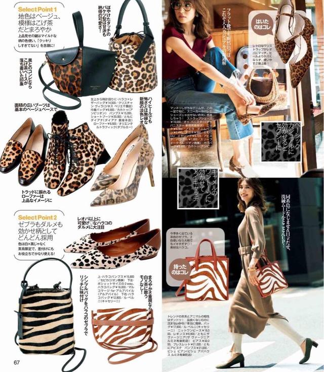 动物纹样的图案作为鞋子也不错,更优雅和低调。在脚上穿上一双豹纹图案或其它动物纹样图案的鞋子,精巧优雅,还不会和全身职业风格的穿搭有视觉上的冲突。鞋子最好是选择凉鞋或高跟鞋。图案的面积越小视觉的冲击力就越弱,与衣服能更好的相融。