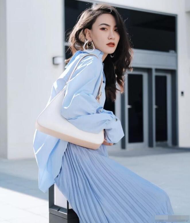 ②百褶裙+衬衫外套,看看细节就能看出差异了,首先它是偏宽松的风格,稍微有点前短后长的设计,后领口有个小开叉设计,满满的小心思。宽松的版型比一般的衬衫“藏肉能力”更强,自带简洁率性,又添加了设计感,搭配一条同色系的蓝色百褶裙,同色系的搭配更容易搭配出高级感,裙子的颜色有点偏紫色调的蓝,虽然是同色系但是也有层次感。面料有点光泽感,在阳光下微闪,整体的配饰搭配就是蓝色+白色,感觉就是将蓝天白云穿在了身上有如清风拂面,自带清爽属性。